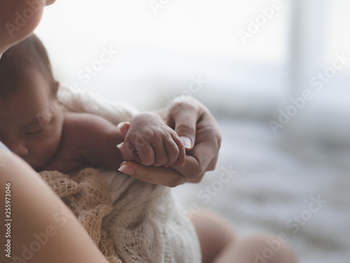 Close Up Mother Holding Hands Asian Female Newborn Baby And